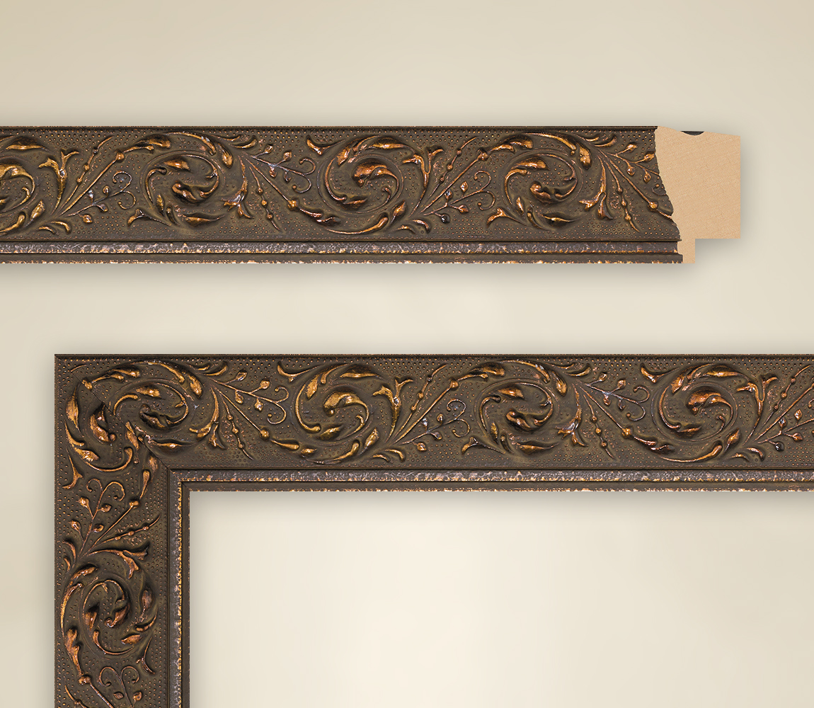 タペストリーフレームシリーズは、箕面モデルを使用したブロンズフレームのオーナメントです。シンプルでありながら、色も形も印象的なペインティングフレームです。フレームは32 mmで、外縁の最高点で部屋の中に突き出ています。全幅は40 mmで、設計者はその上に2つの領域を組み込んでいます。上面図の大部分は、装飾品が付いた上部の太い境界線で占められています。壁から、本物の木製バーのこの部分は、上向きに揺れ、次に浅い角度で下向きに平らになる舌として絵に現れます。背景は、マットなミディアムブラウンブロンズトーンで、いくつかの明るいニュアンスが点滅しています。銅板の彫刻を連想させ、素晴らしい構造を広げている小さな金属のようなドットがこれに適用され、最初は背景に保持されています。光沢のある明るいブロンズ色とその他の装飾が追加されています。デザイナーはここで花の要素を選びました。非常に繊細な巻きひげを示し、その端はあちこちで球根のつぼみで終わります。それにもかかわらず、編組の間に大量の空気を巧みに残しているため、全体的な外観は非常に良好です。細くてシンプルなダブルバーは、画像の終わりを保証します。 |