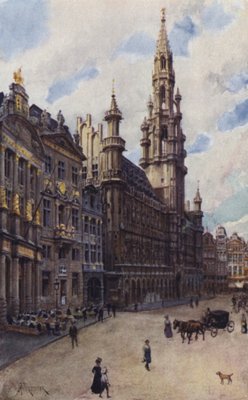 ブリュッセル、ホテル・ド・ヴィル(ブラッスール邸、シーニュ邸、エトワール邸を示す)(カラーリトグラフ)(Hotel de Ville, Brussels (showing La Maison des Brasseurs, La Maison du Cygne, and La Maison de l'Etoile) (colour litho))アメディ(後)フォレスティア |