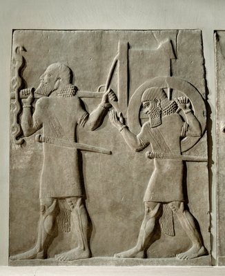 (Relief depicting two soldiers carrying the king's war chariot, from the Palace of Sargon II, Khorsabad, Iraq (gypsum))