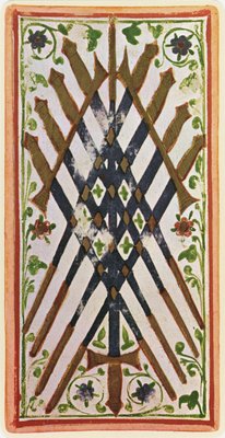 六刀の剣、「ヴィスコンティ」デッキのタロットカードの複製、1441-47(The Six of Swords, facsimile of a tarot card from the 'Visconti' deck, 1441-47 )ボニファシオ・ベンボ |