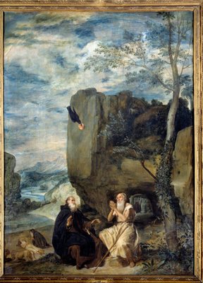 大聖アンソニー(または隠者聖アンソニー、アッベ聖アンソニー)と隠者聖パウロ。ディエゴ・ロドリゲス・デ・シルヴァ・イ・ベラスケス(1599-1660)による絵画、1635年頃。キャンバスに油彩。薄さ:2.57 X 1.88m。マドリード、プラド美術館(Saint Anthony the Great (or Saint Anthony the Hermit or Saint Anthony the Abbe) and Saint Paul Hermit. Painting by Diego Rodriguez de Silva y Velasquez (1599-1660), circa 1635. Oil on canvas. Dim: 2.57 X 1.88m. Madrid, Musee Du Prado)ディエゴ・ベラスケス |