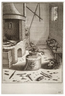 (A sculptor's studio with the severed head of Medusa lying on the ground (engraving))