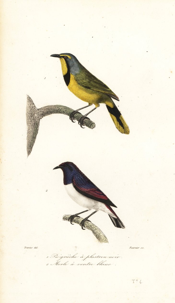 Bokmakierie とすみれ色のムクドリ。(Bokmakierie and violet-backed starling.)エドゥアール(後)トラヴィ |