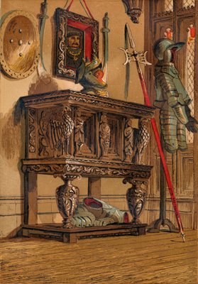 (Elizabethan sideboard or cupboard at Warwick Castle (coloured engraving))