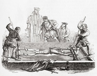 1890年頃、ロンドンで出版されたウィリアム・ヒックマン・スミス・オーブリー(1858~1916)著「The National and Domestic History of England」より。(Man being tortured on the rack, from 'The National and Domestic History of England' by William Hickman Smith Aubrey (1858-1916) published London, c.1890 (litho))英語学校 |