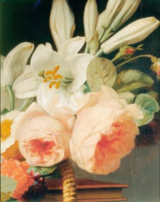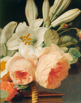 バスケットに入ったユリとバラの花束が、花瓶の上に置かれている。(Bouquet de lys et de roses dans une corbeille pose sue une …)エーリッヒ・レッシング |