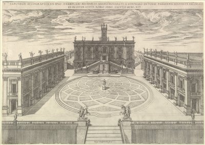 ミケランジェロが設計したイタリア、ローマの議事堂広場を模したエッチング。(Etching after Michelangelo's design for the Capitol Square in Rome, Italy)エティエンヌデュペラック |