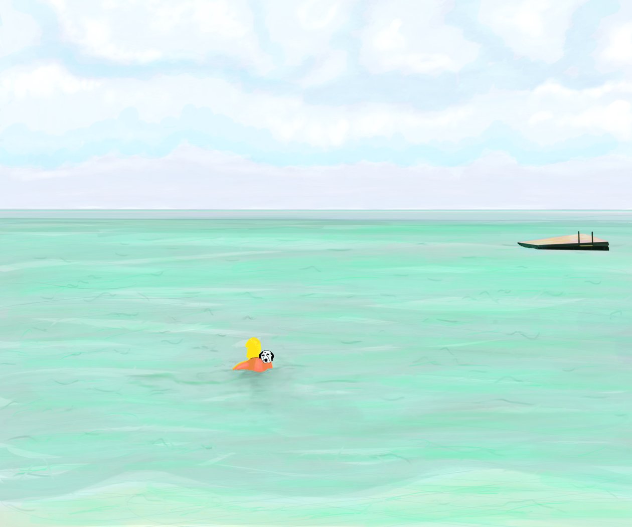 海で犬と泳ぐ女性 作: エヴァン・スクラー