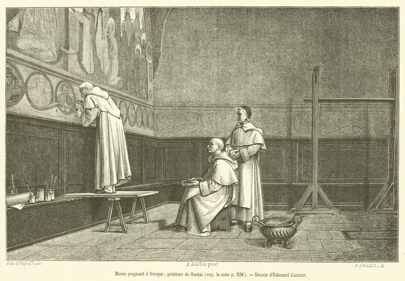 フレスコ画を描いている修道士(エングレービング 作: フランス語学校