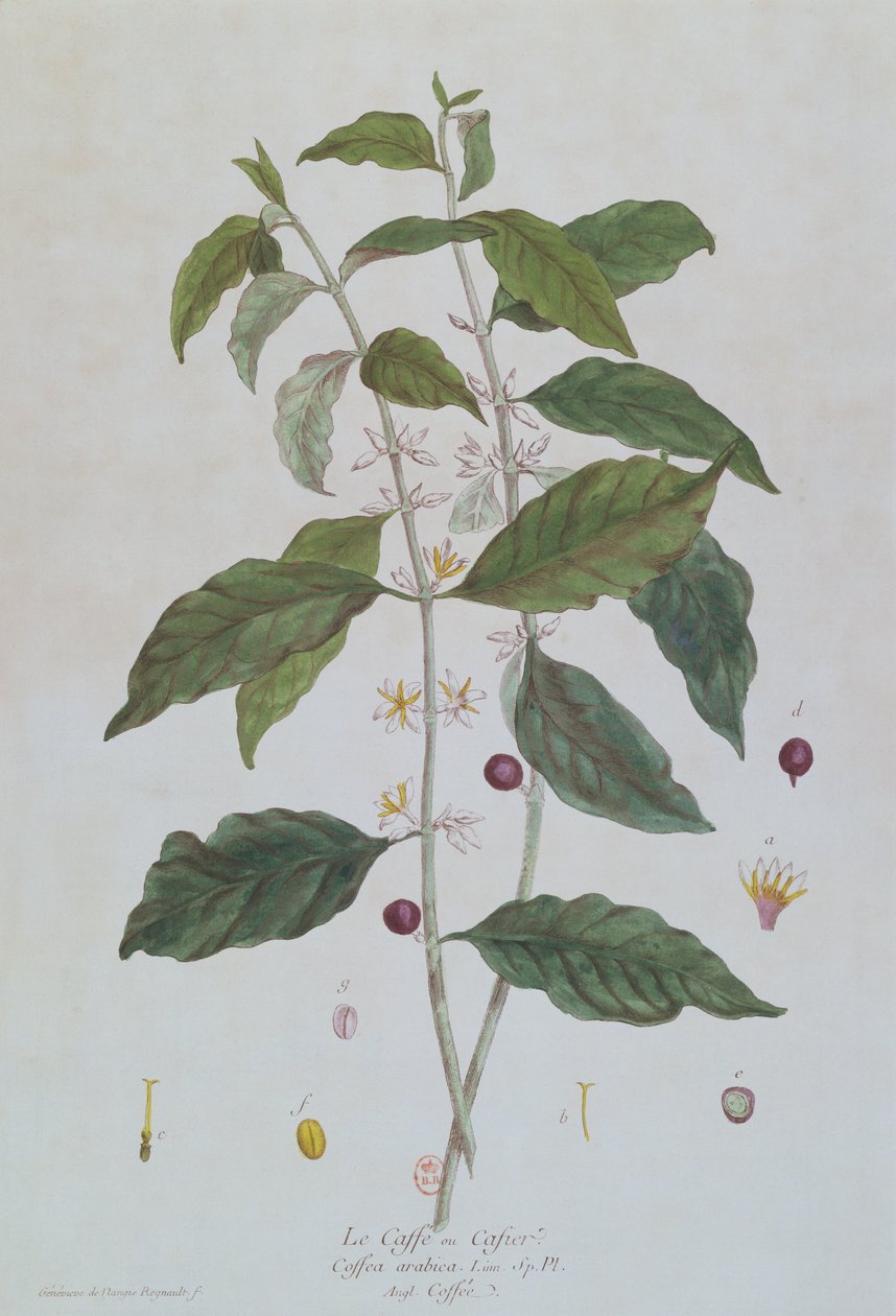 1774年にパリで出版されたニコラフランソワルノー(1746-1810)の「ラボタニークミーゼラポーティードトゥールルモンド」のコーヒーノキアラビカ(コーヒー)植物プレート(Coffea Arabica (Coffee) botanical plate from 'La Botanique mise a la portee de Tout le Monde' by Nicolas Francois Regnault (1746-1810) published in Paris, 1774 )ジュヌヴィエーヴ・ルノー・ド・ナンギス |