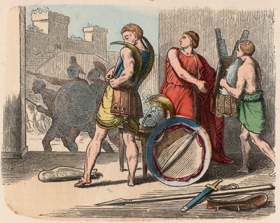 (Ancient History. Greece. Greek warriors arming themselves for war. ... (engraving))