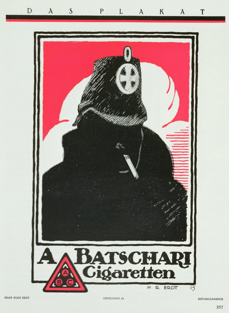 1915年のドイツのポスターアートのコレクション「Das Plakat」からのA. Batschari Cigarettesの広告(Advertisement for A. Batschari Cigarettes, from 'Das Plakat', a collection of German poster art, 1915 )ハンス・ルディ・エルト |