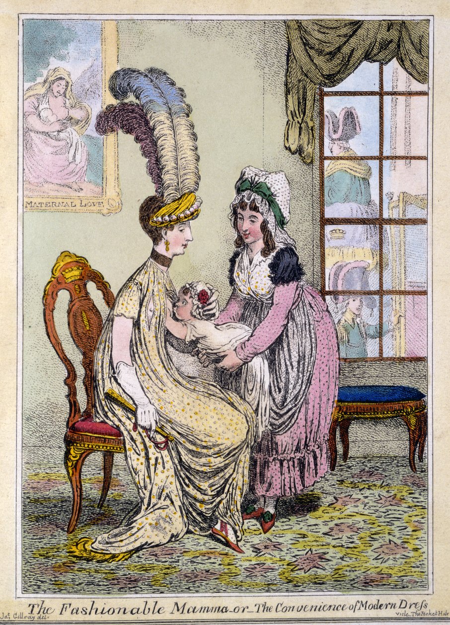 ファッショナブルなマンマ、またはモダンドレスの便利さ、パブ。 1796年のロンドン(手描きの彫刻)(The Fashionable Mamma, or The Convenience of Modern Dress, pub. London in 1796 (hand-coloured engraving))ジェームズ・ギルレイ |
