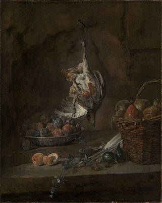 (Dead partridge hung by one leg, bowl with prunes and a basket with pears (painting on canvas))ジャン・バプティスト・シメオン・シャルダン |