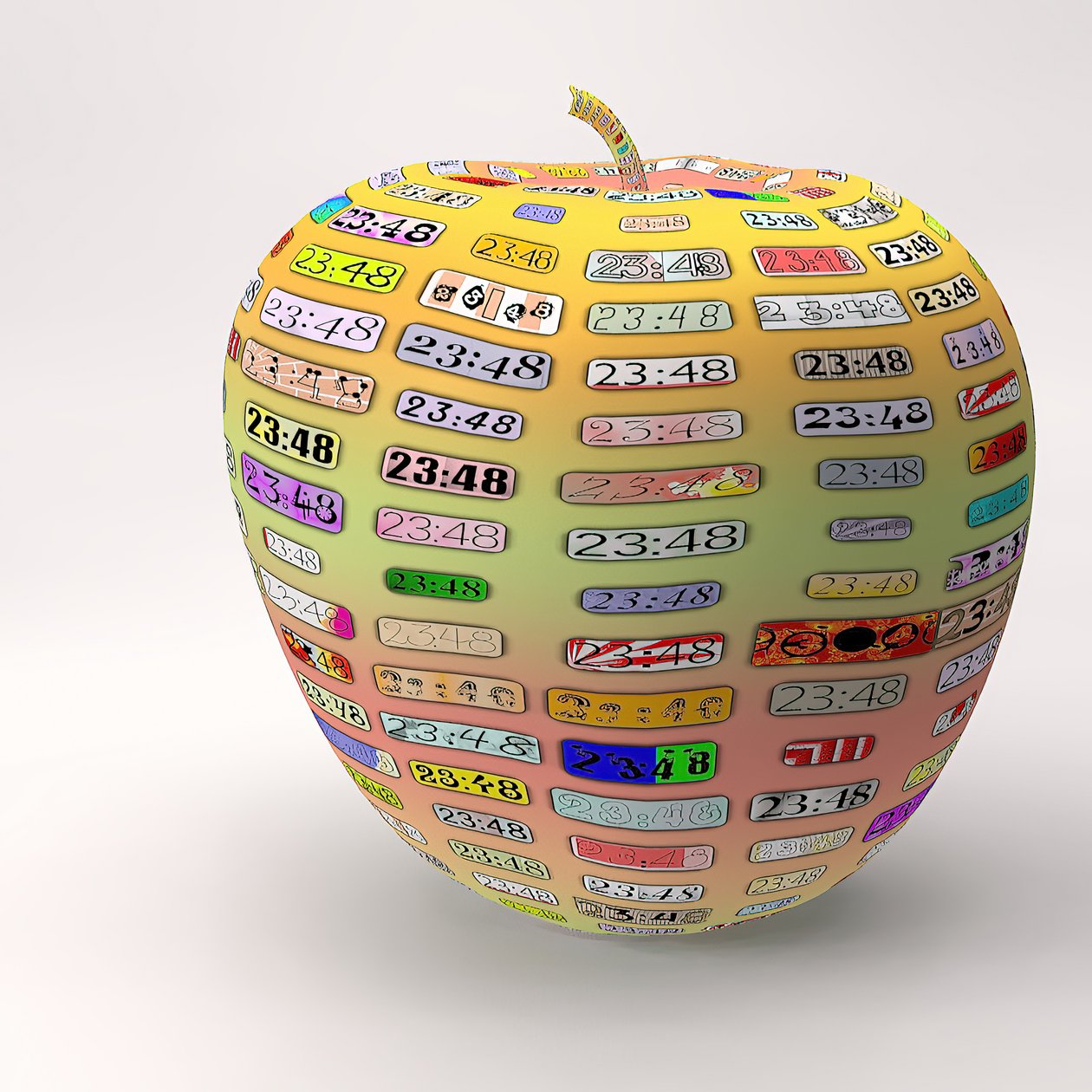 またリンゴか。こちらの質感は、複雑な方法で作られています。時刻表示はテクスチャーで、さまざまなバリエーションを組み合わせて、リンゴの上に配置しました。リンゴはスモールもありますが、ラージの方が100倍美しいです。