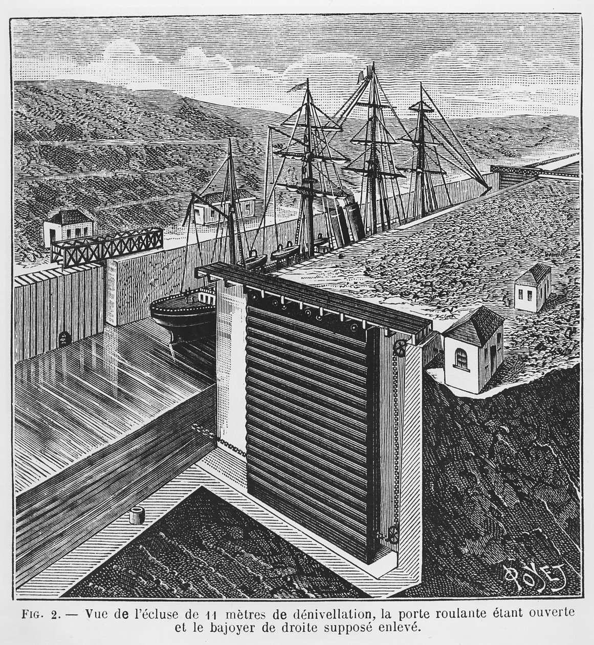 パナマ運河の水門のギュスターヴエッフェル(1832-1923)によるデザイン、雑誌「Le Genie Civil」からのイラスト、1888年(bw彫刻の写真)(Designs by Gustave Eiffel (1832-1923) for locks in the Panama Canal, illustration from the magazine 'Le Genie Civil', 1888 (bw photo of engraving))ルイ・ポエト |