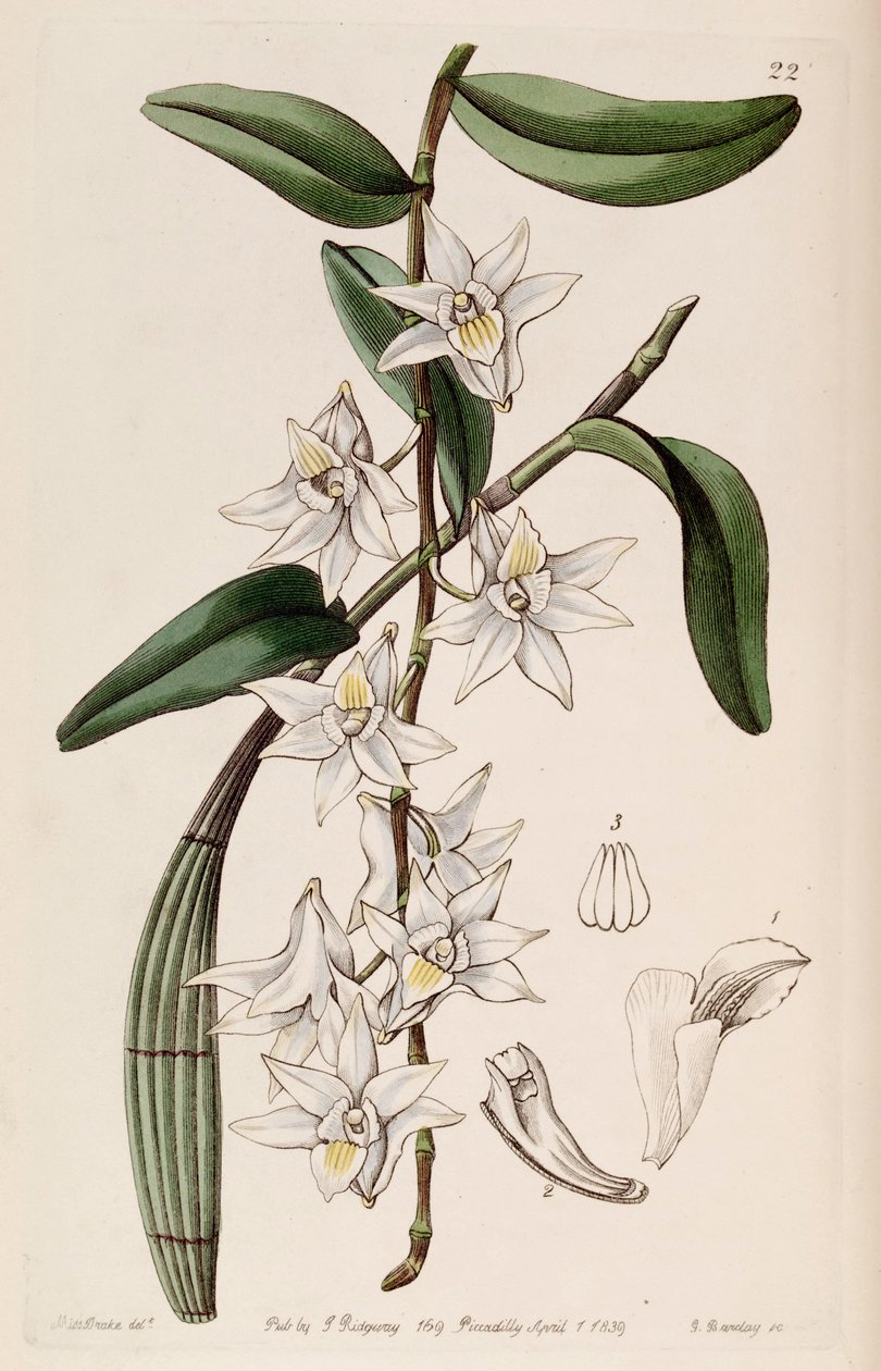 Bulbophyllum eberhardtiiまたはBulbophyllum longiflorum(syn。Cirrhopetalum thouarsiiとして) Dactylorhiza foliosa(syn。Orchis foliosaとして) Cattleya intermedia(syn。Cattleya intermedia var。Pallidaとして) Laelia furfuracea ソブラリアマクランサ、1837年〜43年 デンドロビウムリンドレイ(デンドロビウム凝集体) Calanthe sylvatica(syn。Calanthe masucaとして) Studarettia biloba(syn。Listrostachys biloba) Chloraea piquichen(syn。Chloraea virescensとして) Bulbophyllum umbellatum(スペルトのBolbophyllum umbellatum) Acianthera saurocephala(syn。Pleurothallis saurocephalaとして) Epidendrum cristatum(syn。Epidendrum raniferumとして) Tainia bicornis(syn。Ania bicornisとして) Graphorkis luridaまたはGraphorchis lurida(syn。Eulophia luridaとして) モルモードアロマティカ