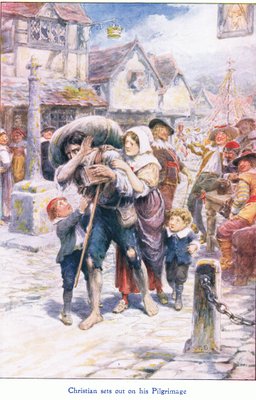 クリスチャンは彼の巡礼に出発します, ジョン・F・ショー&カンパニーが発行した巡礼者の進歩から, 1900年頃 (カラーリソ)(Christian sets out on his pilgrimage, from The Pilgrims Progress published by John F Shaw & Co, c.1900's (colour litho))ロバート・アンブローズ・ダドリー |