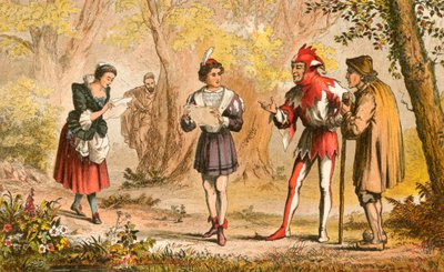 (Rosalind speaks in As You Like It, Act III, Scene II, 'Peace! Here comes my sister', from 'The Illustrated Library Shakespeare', published London 1890 (colour litho))