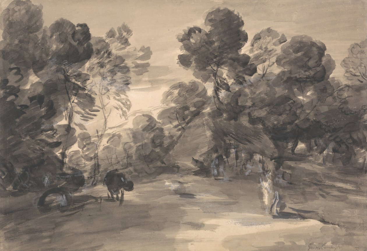 数字、コテージ、牛と樹木が茂った風景(Wooded Landscape with Figures, Cottage and Cow)トーマス・ゲインズバラ |