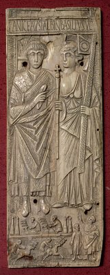 (Plaque depicting Basiliscus, Emperor of the East (d.478) with a chariot race below, Roman, 480 AD (ivory))