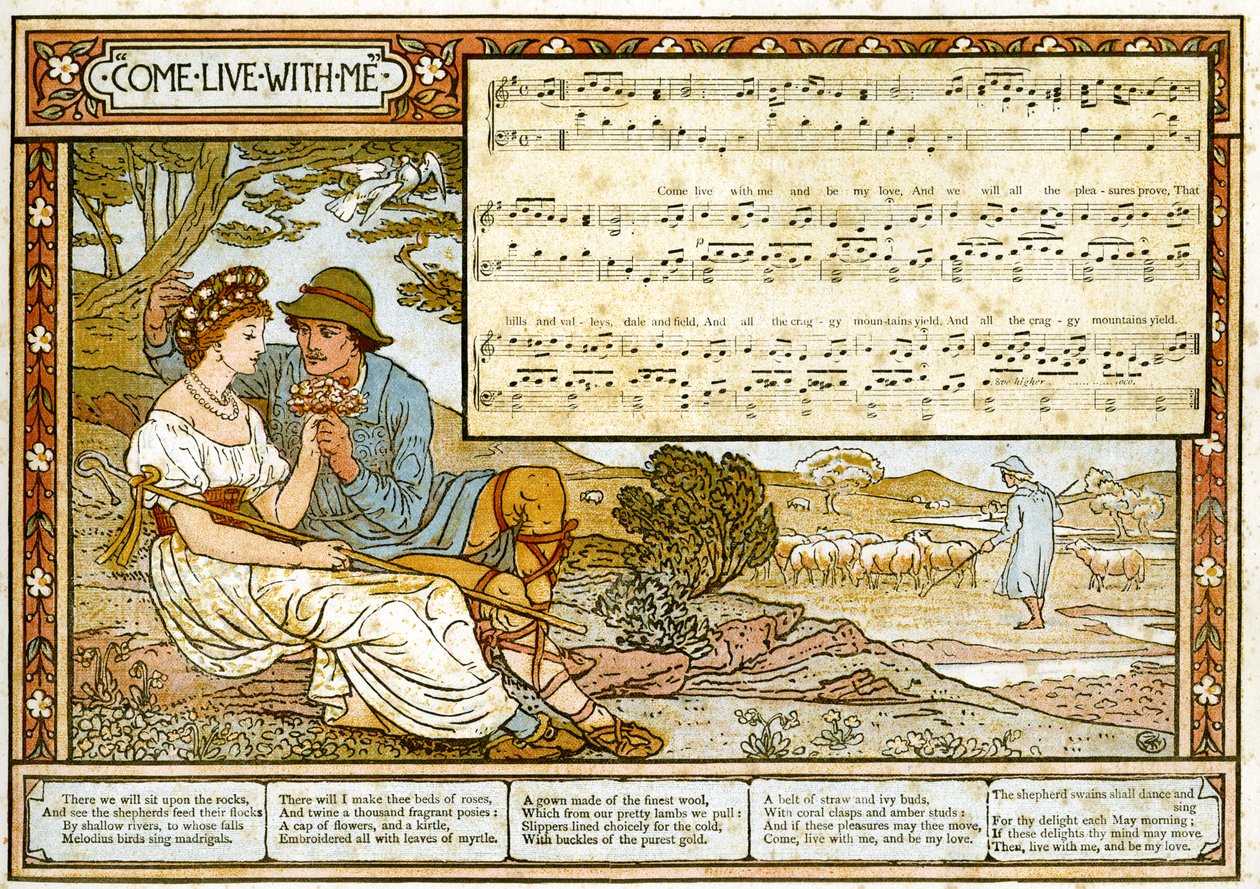 「彼の愛への情熱的な羊飼い」、「パン・パイプス」の歌のイラスト、古歌の書、新しくアレンジされ、テオの伴奏付き。 Marzials、George Routledge und Sonsによってロンドンで公開('The Passionate Shepherd to his Love', song illustration from 'Pan-Pipes', A Book of Old Songs, Newly Arranged and with Accompaniments by Theo. Marzials, published in London by George Routledge und Sons)ウォルター・クレーン |