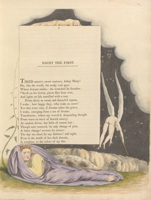 Youngs Night Thoughts、ページ1、彼のダウニーピニオンフライの悲劇(Youngs Night Thoughts, Page 1, Swift on His Downy Pinion Flies from Woe)ウィリアム・ブレイク |