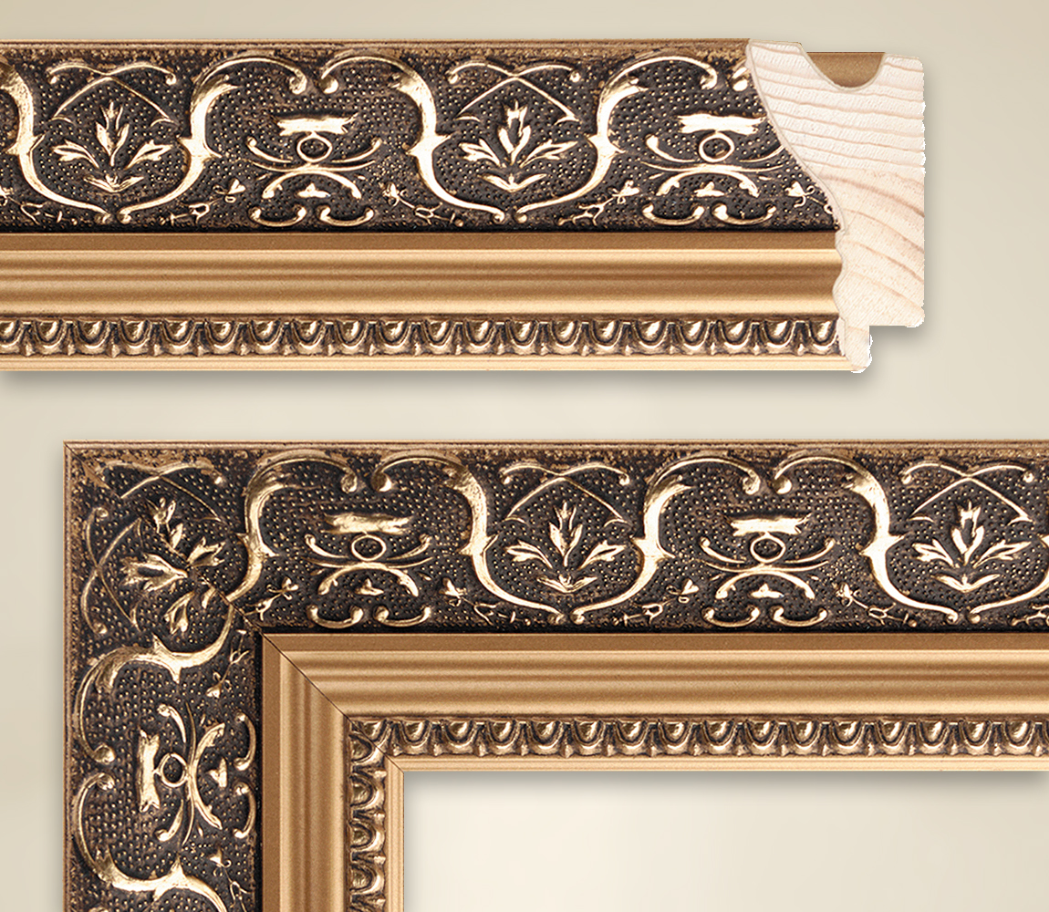 | ブロンズで鋳造されたように、フベルタの額縁はその完全な美しさを示しています。フレームが本物の木で作られていなかった場合、それは実際に青銅で作られていると想定されます。しかし、木製の帯は金青銅で処理されていました。そして完全に、目は実際に最も美しい形の金属合金を知覚します。逆に言えば、フベルタはこの場合、木材が放射する特定の暖かさを欠いていました。幅59 mm、高さ37 mmの画像フレームは、4つの異なるストリップに分割されています。内側から非常に繊細なバーで始まり、小さな丸い飾りが付いた細いバーが続き、それが単純な飾りを抱きしめます。この組み合わせは明るい青銅色のトーンに保たれ、最後の幅の広いバーは背景の暗い色合いになります。フレームストリップには小さな爪が隠れており、花の彫刻が施された要素が含まれています。光沢のあるゴールドトーンで、フレームに鮮やかな仕上がりを保証します。フベルタは、すべての絵の壁に特別な輝きをもたらします! |